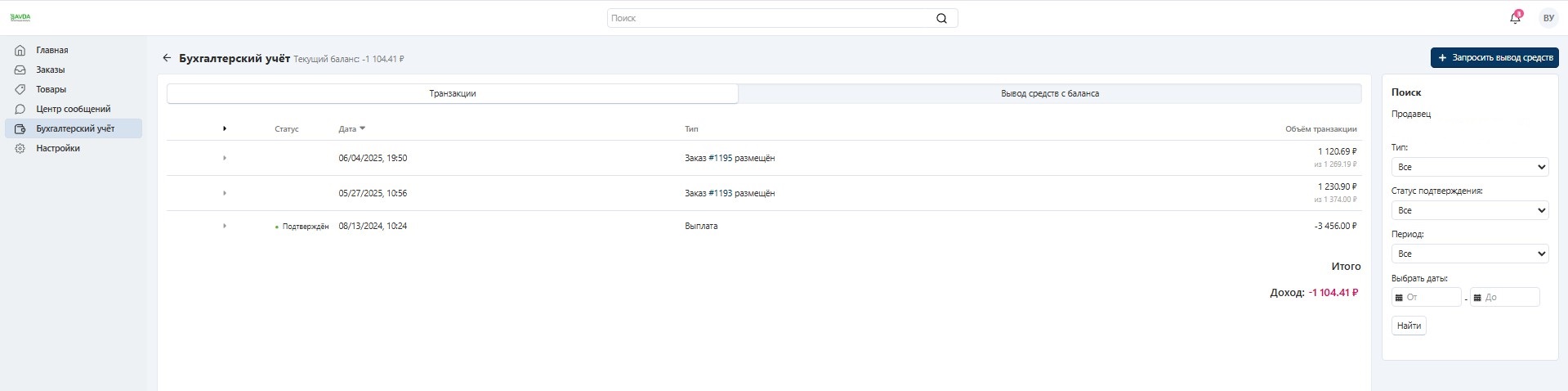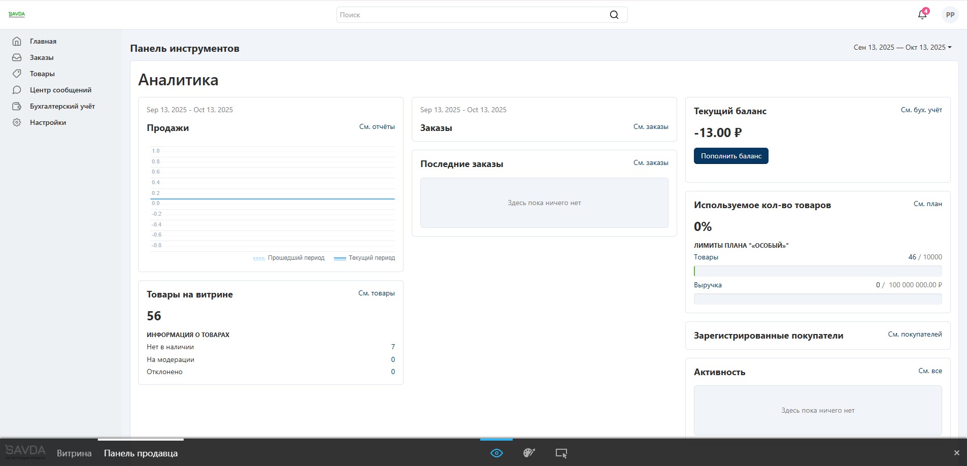 Добро пожаловать на портал продавца SAVDA.RU! На его главной странице есть много полезного: меню, виджеты и важная информация.