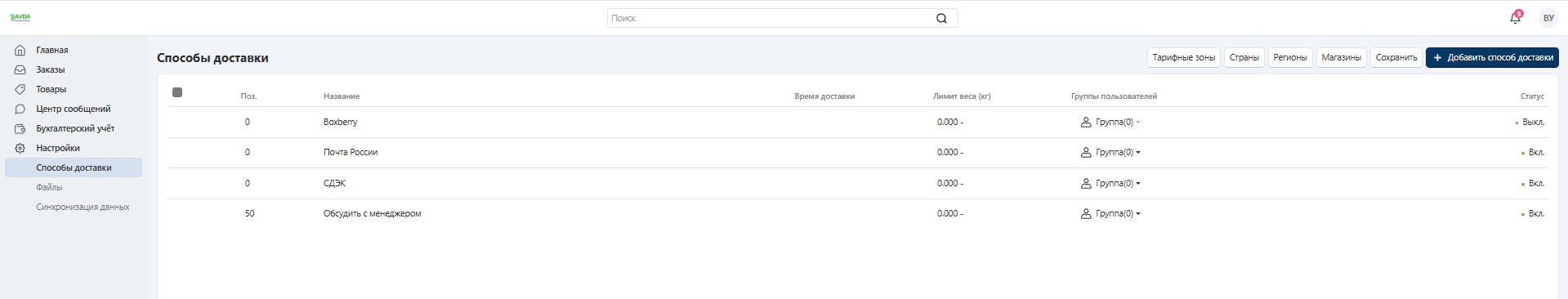 - Способы доставки - в данном разделе настраиваются способы доставки заказов.
