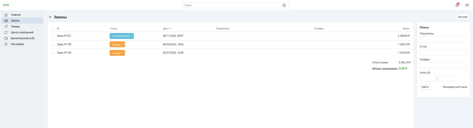 Заказы - в данном разделе вы можете просматривать полученные от покупателей заказы и управлять ими;